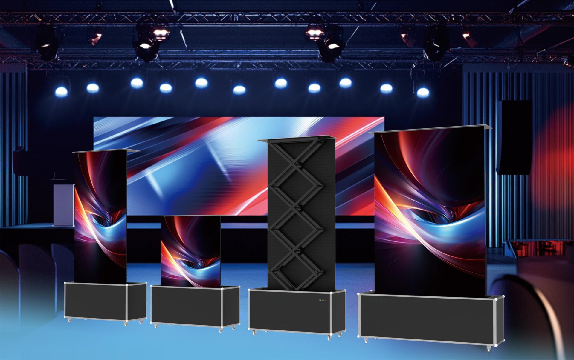 Допускаются разные размеры. Имеет схожую с жалюзи технологию использования: благодаря скрытой установке с легкостью складывается вверх и вниз по нажатию одной кнопки. Есть возможность дистанционного управления. По запросу заказчика возможна дополнительная установка боковых опор. Складывающиеся светодиодные экраны обладают высоким разрешением, реалистичным качеством изображения, превосходной цветопередачей.