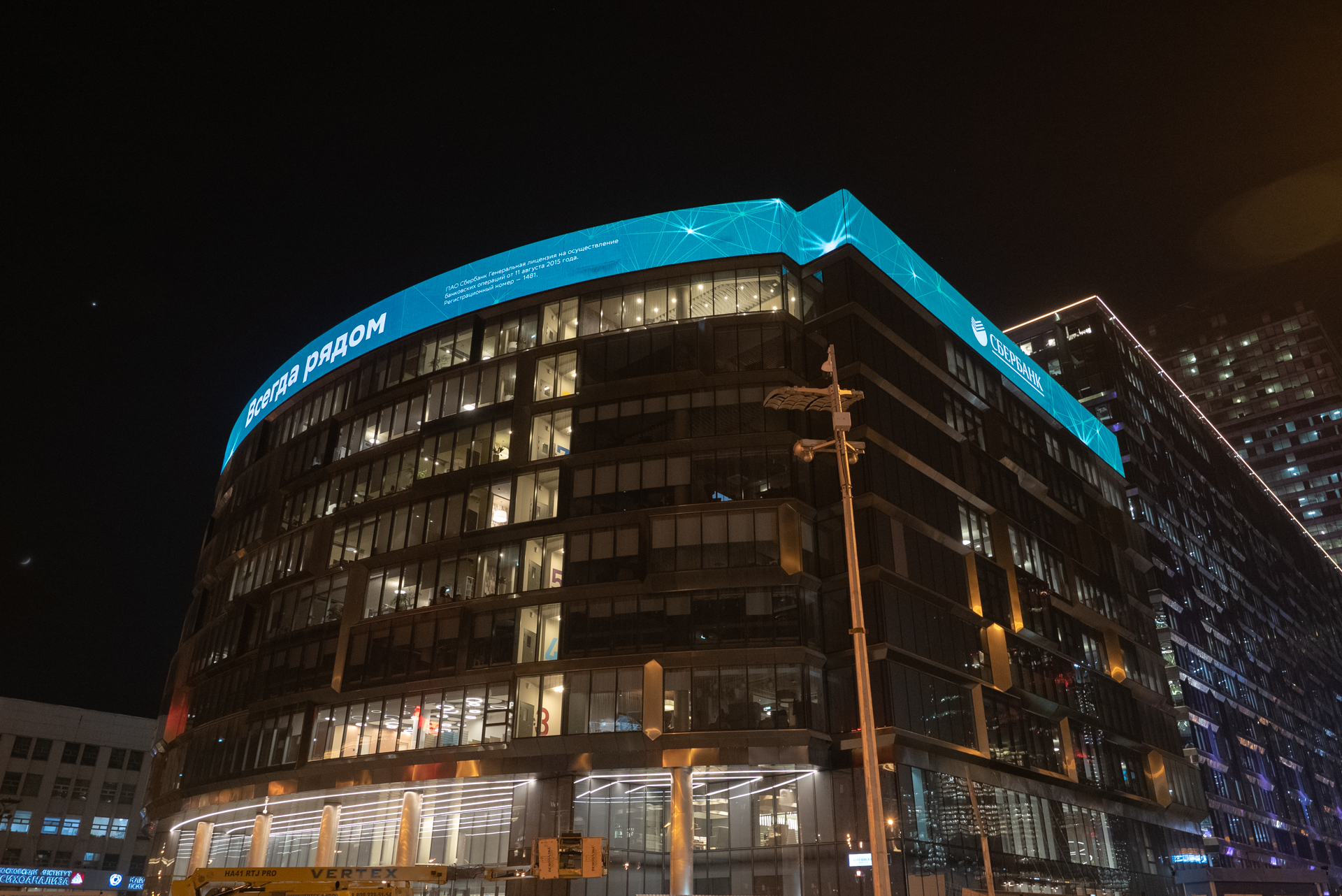 - Изготовление и монтаж конструкций LED экрана радиусного исполнения на крыше фасада главного здания Сбербанка.