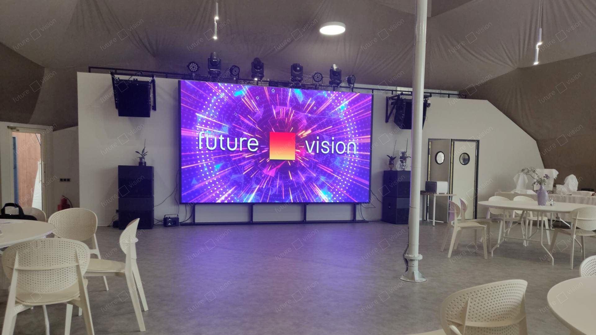 Светодиодный экран размером 4480 х 2560 мм обладает повышенной чёткостью изображения, а также обеспечивает отличную видимость с любого места в шатре.