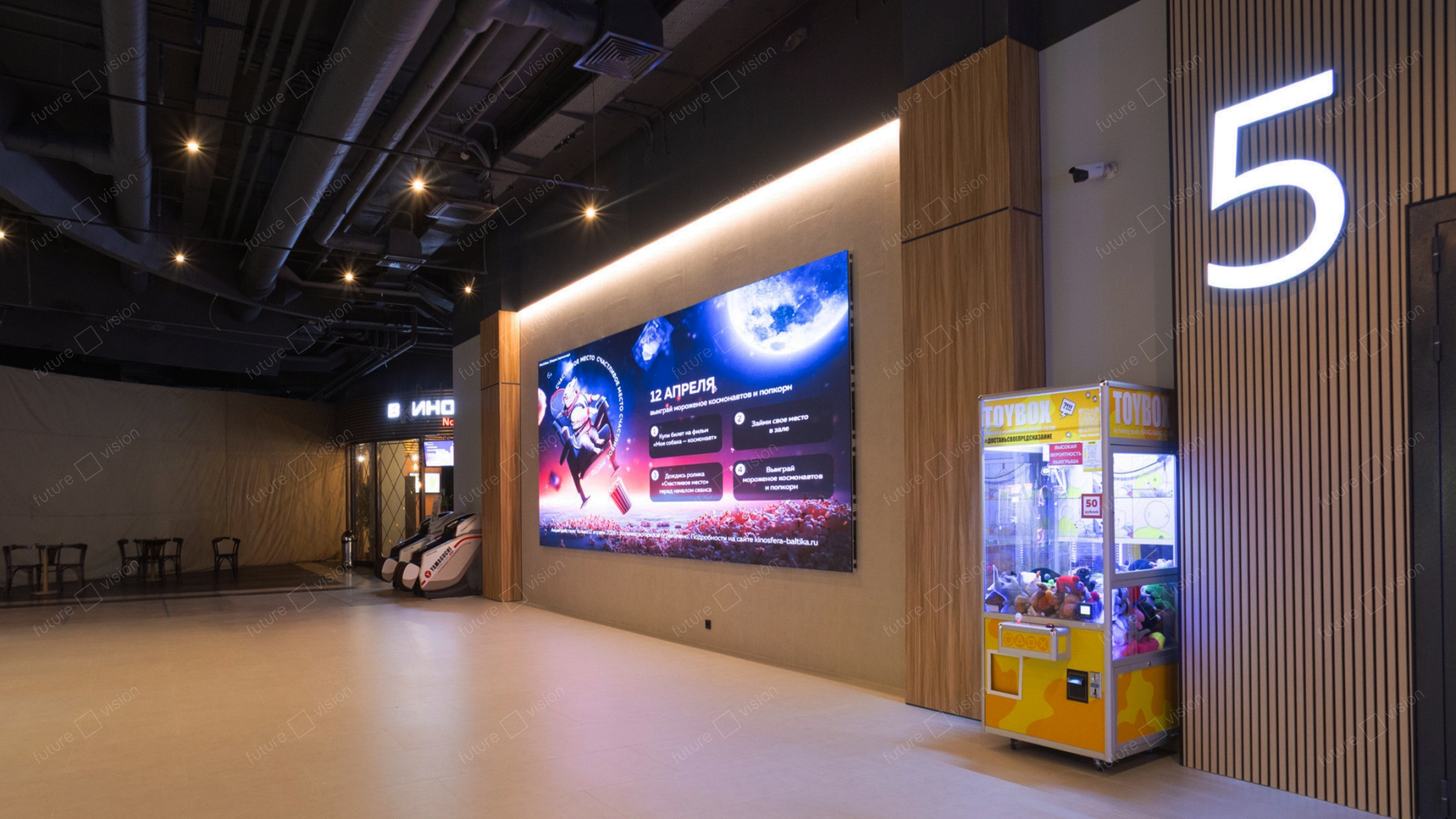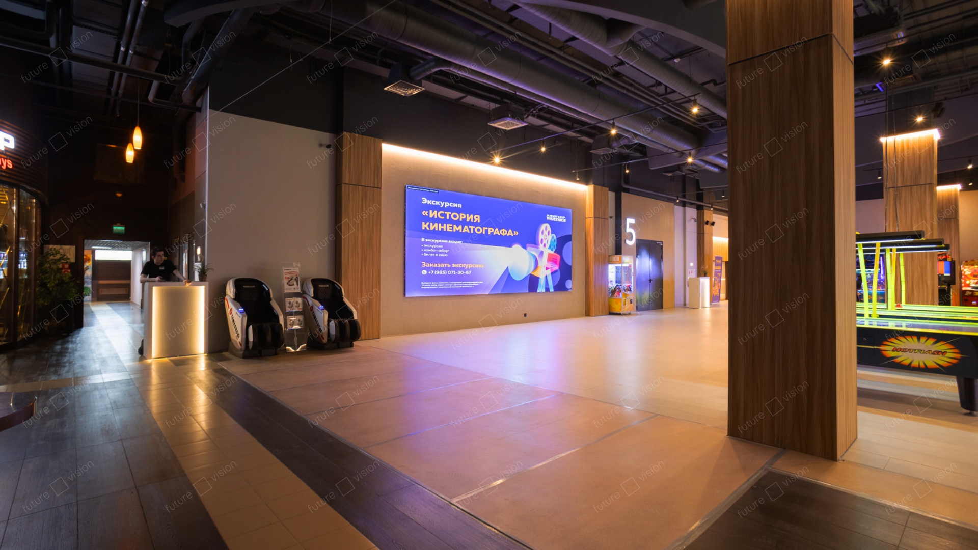 Компания Future Vision изготовила и установила светодиодный экран с шагом пикселя Р2,5 для кинотеатра "Балтика" в ТРЦ "Калейдоскоп", город Москва. Экран установлен на 3 этаже и используется для продвижения собственного бренда, а также анонсирования афиш.